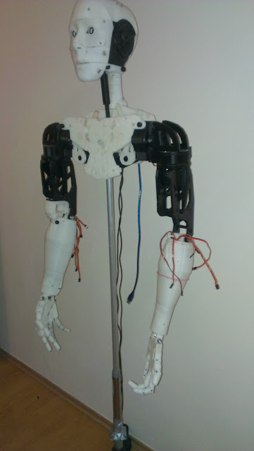 Konečne som vyriešil nejaké problémy s tlaciarnou, vytlačil som nový extruder, začal som používať nový software Cura. Vďaka tomu sa mi podarilo dokončiť tlač prstov ľavej ruky. Vytlačenie predlaktia bola už potom iba otázka času. Este treba namontovať tiahla - šľachy , pridať servo pre biceps a vytlačiť vrchný diel dlane.